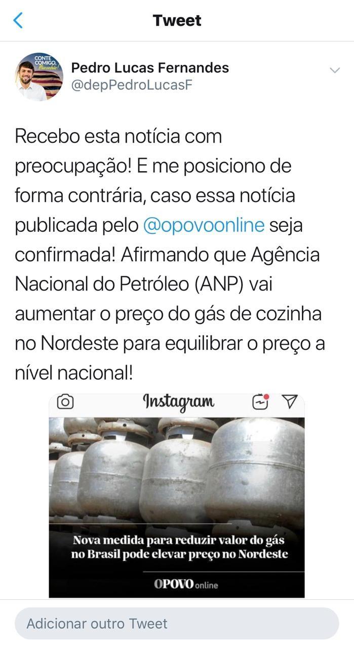O deputado Pedro Lucas Fernandes (PTB), usou seu perfil nas redes sociais para se manifestar contrário a um possível aumento do Gás de Cozinha para
