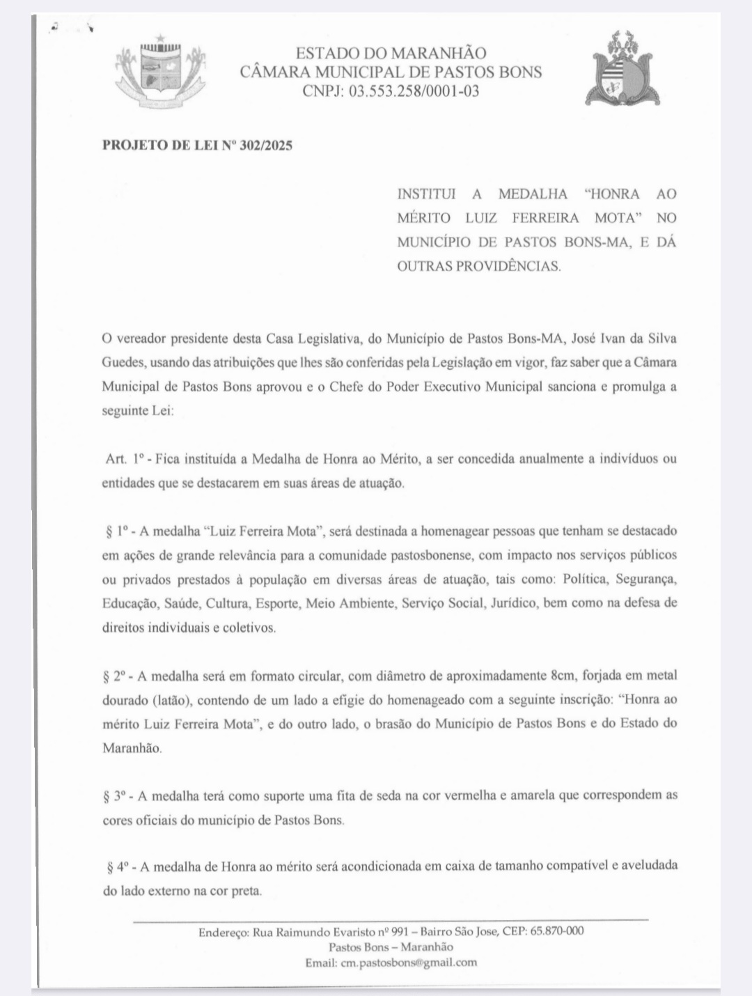 A Câmara Municipal de Pastos Bons aprovou, nesta quarta-feira (18), o Projeto de Lei nº 302/2025, de autoria do presidente da Casa, vereador José Ivan da Silva Guedes, que institui a Medalha de Honra ao Mérito Luiz Ferreira Mota. A honraria será concedida anualmente a duas pessoas que se destacarem por relevantes serviços prestados ao município em diversas áreas, como saúde, educação, cultura, esporte, meio ambiente e assistência social.