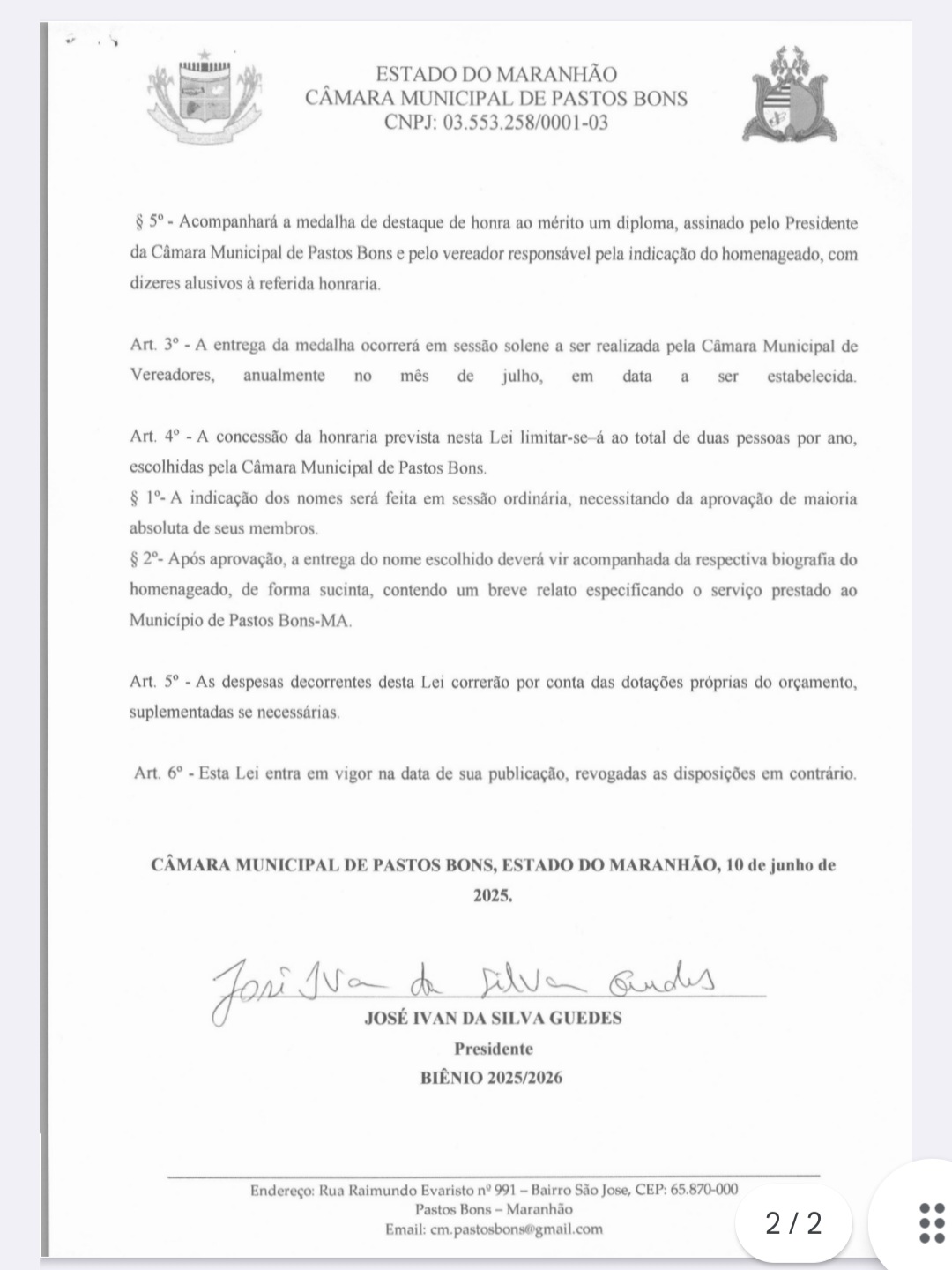 A Câmara Municipal de Pastos Bons aprovou, nesta quarta-feira (18), o Projeto de Lei nº 302/2025, de autoria do presidente da Casa, vereador José Ivan da Silva Guedes, que institui a Medalha de Honra ao Mérito Luiz Ferreira Mota. A honraria será concedida anualmente a duas pessoas que se destacarem por relevantes serviços prestados ao município em diversas áreas, como saúde, educação, cultura, esporte, meio ambiente e assistência social.
