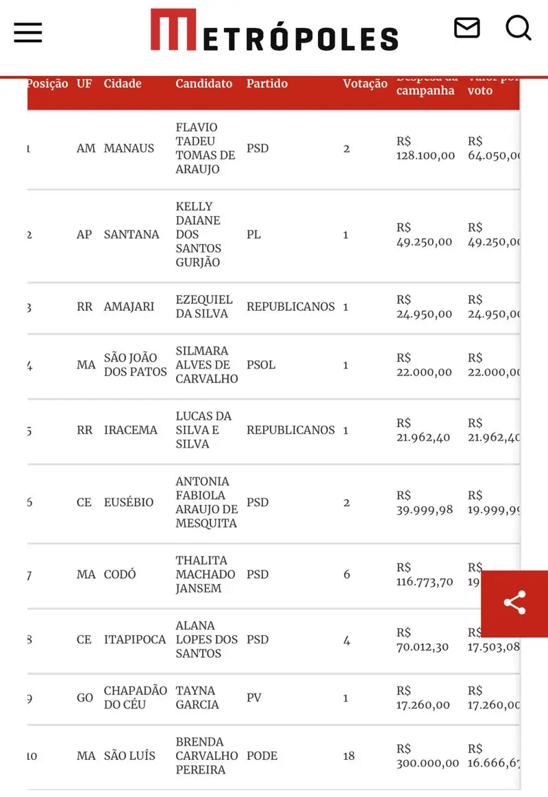 Na sequência nesse ranking, figura candidatos do Maranhão, como Silmara Alves de Carvalho (PSOL), que disputou uma vaga de vereadora na cidade de São João dos Patos. A candidata garantiu apenas um voto nas urnas com R$ 22.000,00 de despesa de campanha. Em Codó, a candidata Thalita Machado Jansem(PSD) recebeu 6 votos e uma despesa de R$ 116.773,70, ou seja, R$ 19.462,28 por voto. Em São Luís, Brenda Carvalho(Podemos) teve 18 votos após gastar R$ 300 mil, um total de R$ 16.666,67 por voto.
