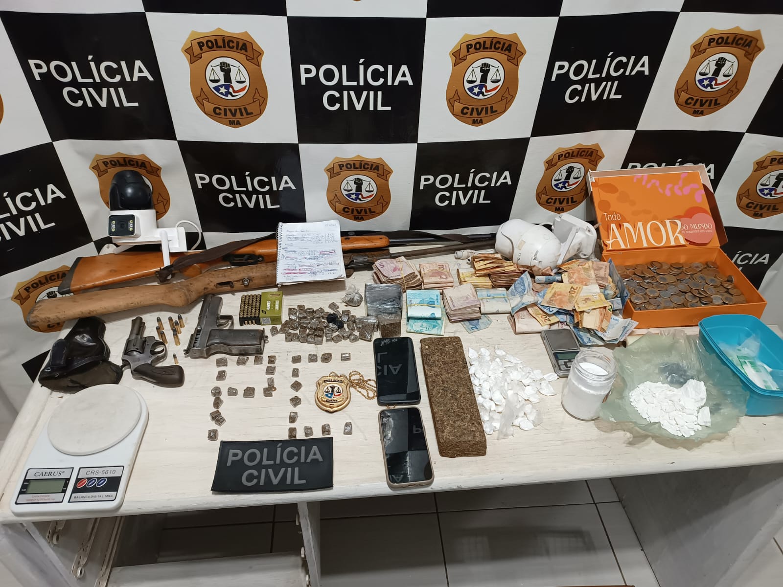 Durante o cumprimento dos mandados, os policiais localizaram uma grande quantidade de drogas, armas e munições. Entre o material apreendido estavam um revólver calibre 32, uma arma artesanal calibre 22, uma arma de pressão adaptada para o mesmo calibre, 51 munições calibre 22, oito munições calibre 32, cinco tabletes de maconha, 72 porções da mesma substância, 72 trouxinhas de cocaína, 227 gramas de cocaína em pó, uma balança de precisão e um caderno com anotações sobre o tráfico. Também foram apreendidos dois celulares, uma faca, um coldre, duas câmeras de videomonitoramento, além de materiais usados para embalar os entorpecentes, como rolo de celofane e saquinhos plásticos.