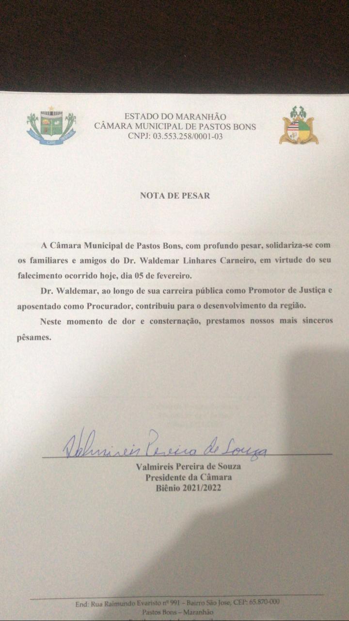 A Câmara Municipal de Pastos Bons, emitiu nota de pesar pelo falecimento do ex promotor de justiça e procurador estadual aposentado, senhor Waldemar Linhares Carneiro, que morava na cidade de Pastos Bons, e por vários anos, atuou no ministério público da região do sertão maranhense.