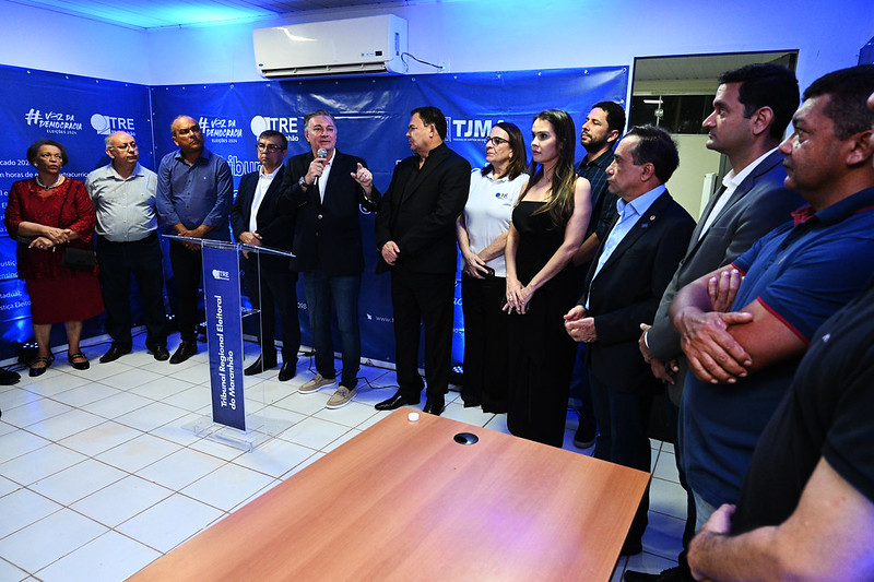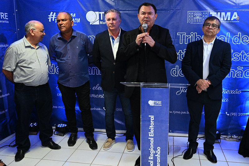 Foto em ambiente interno, em sala com plotagens do TJMA e TRE. à frente, grupo de magistrados e magistradas em pé, durante fala do presidente do TJMA< desembargador Froz Sobrinho