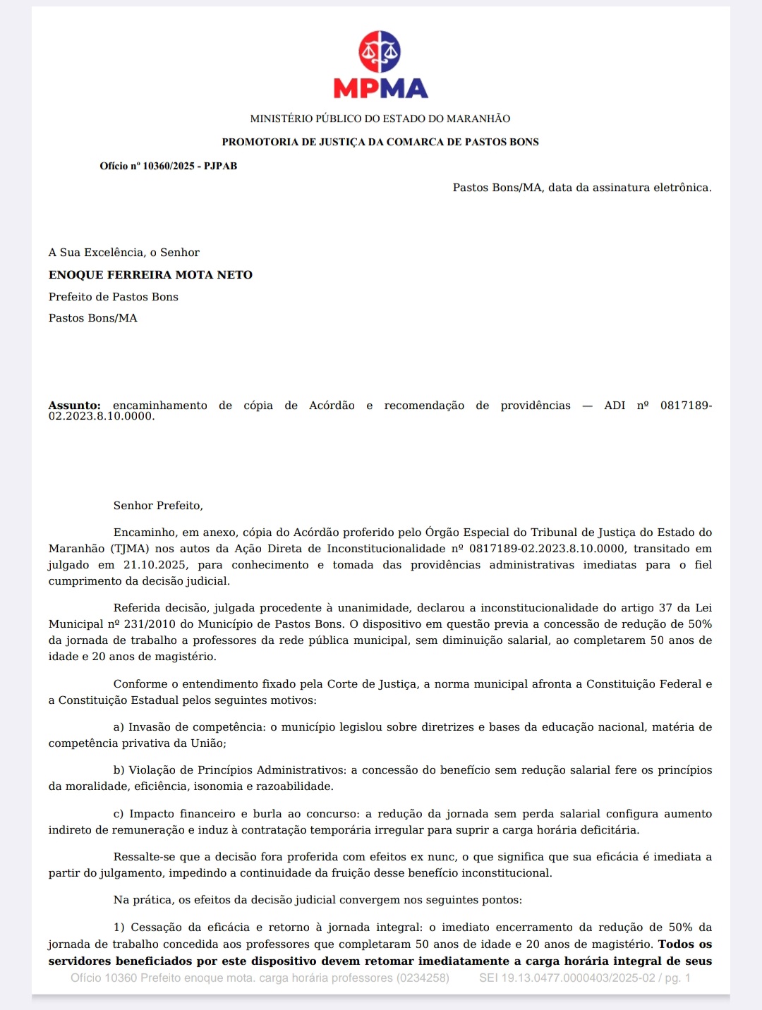 O Ministério Público do Estado do Maranhão recomendou ao prefeito de Pastos Bons Enoque Mota, o cumprimento imediato de decisão judicial definitiva que declarou inconstitucional a redução de jornada de trabalho concedida a professores da rede municipal sem diminuição salarial. A recomendação foi expedida pela Promotoria de Justiça da Comarca de Pastos Bons e tem como base acórdão do Tribunal de Justiça do Maranhão, já transitado em julgado.