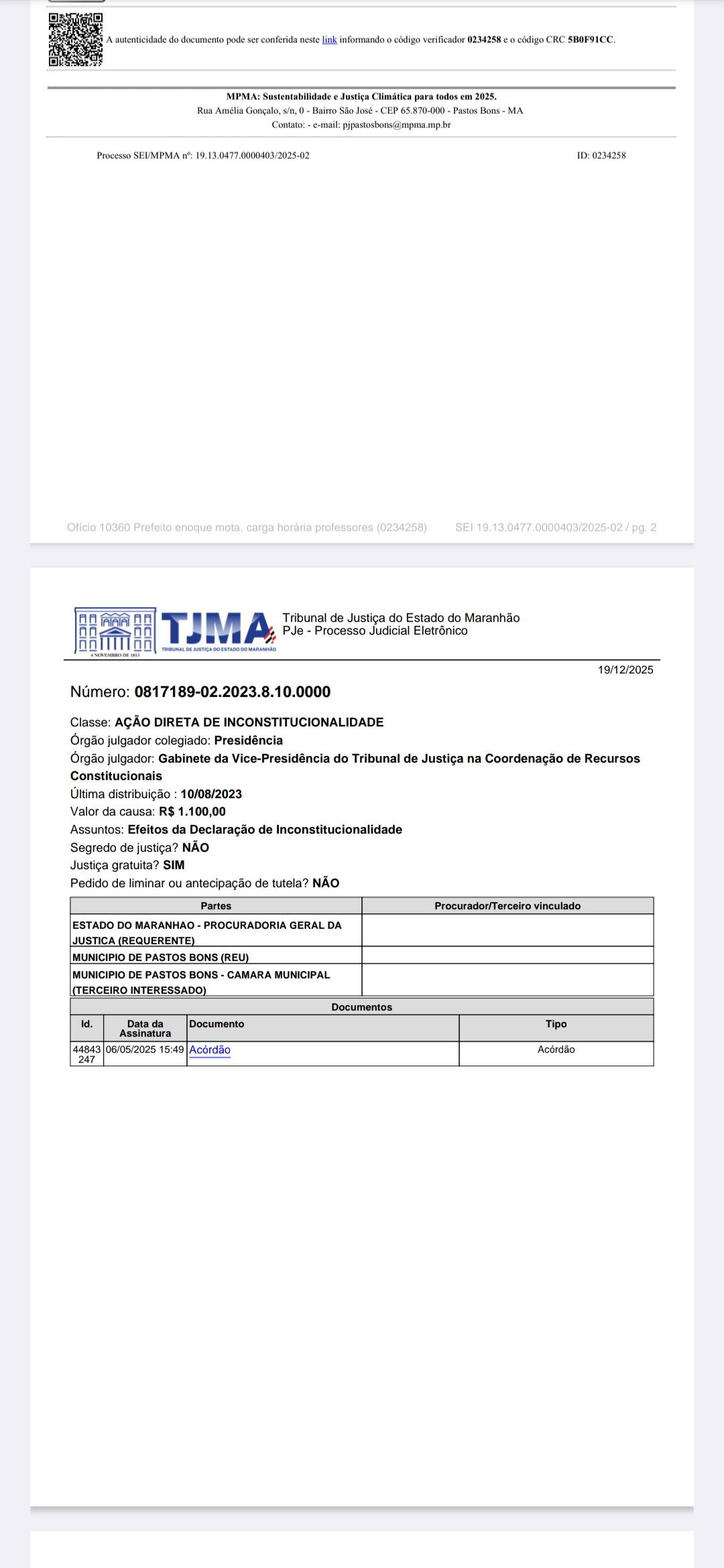 O Município de Pastos Bons chegou a recorrer da decisão, mas o recurso foi negado pelo Tribunal, tornando definitiva a declaração de inconstitucionalidade. O acórdão estabeleceu efeitos imediatos, válidos a partir do julgamento, impedindo a continuidade da concessão do benefício.