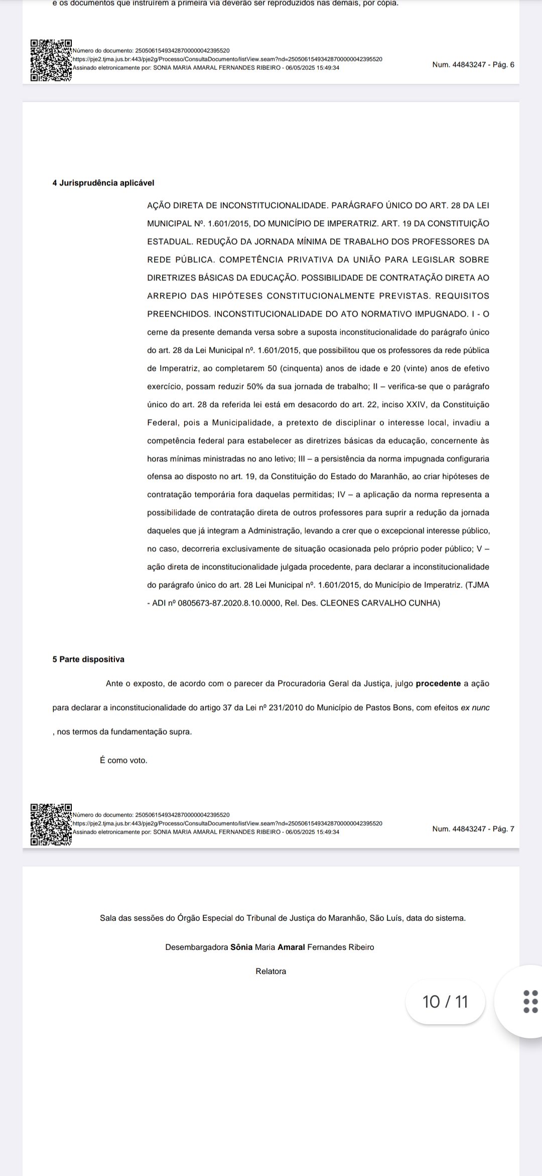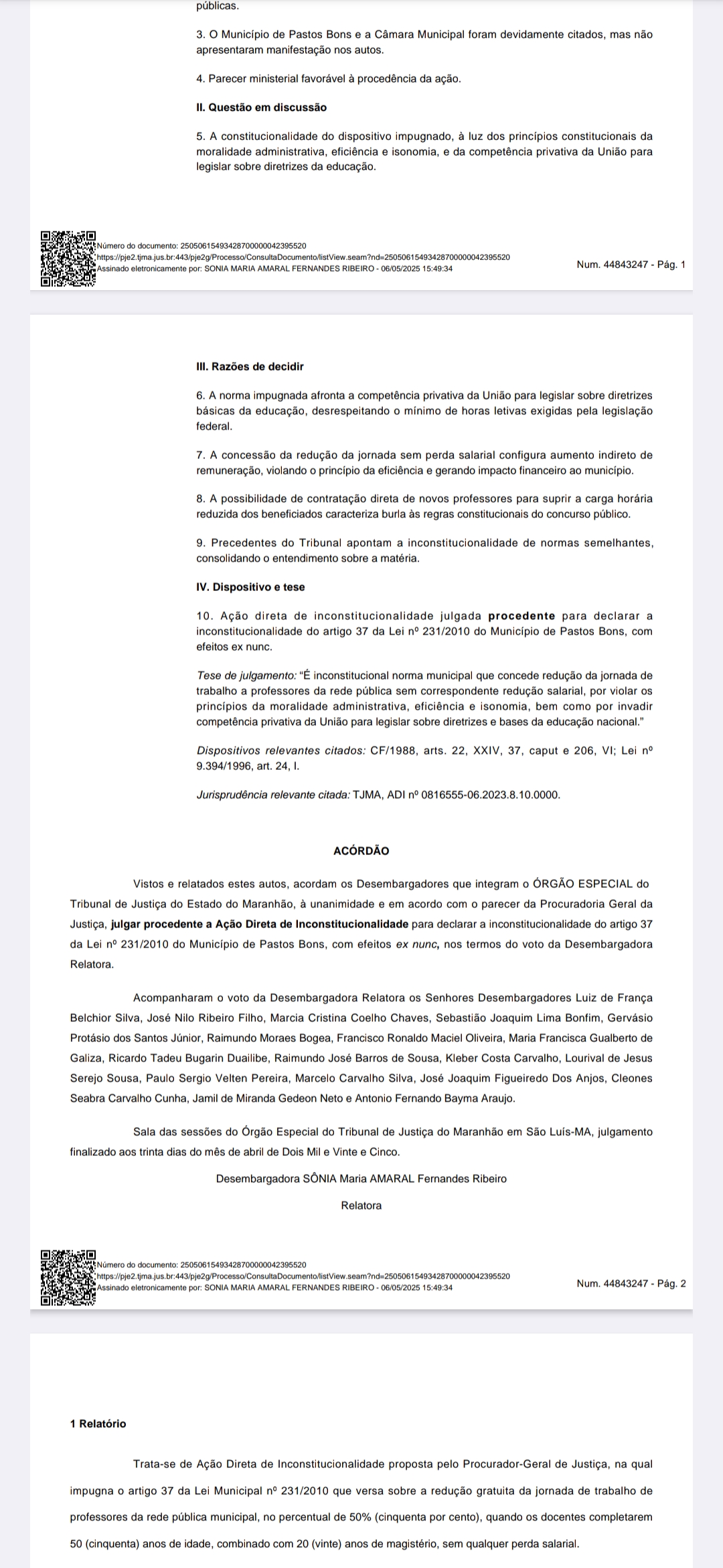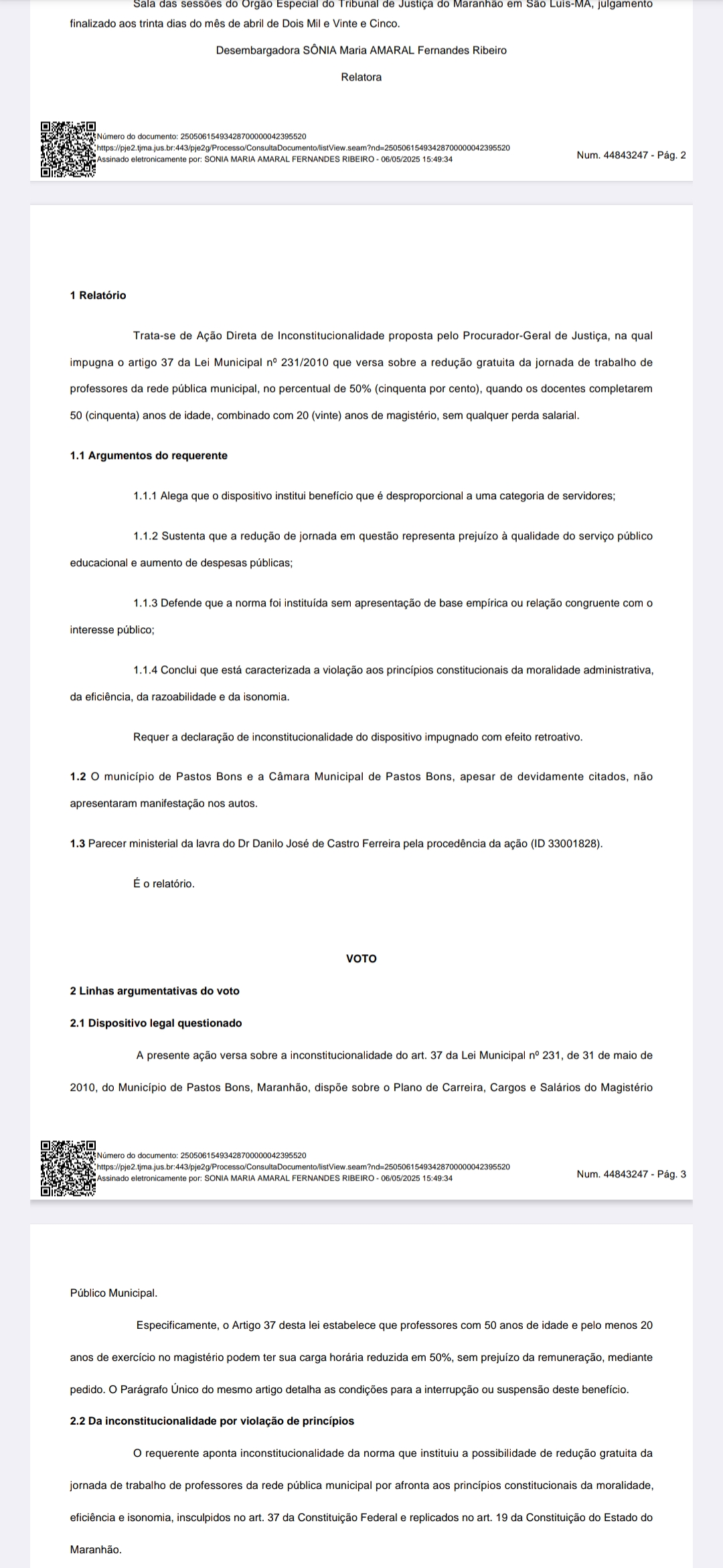 A decisão foi tomada no julgamento da Ação Direta de Inconstitucionalidade nº 0817189-02.2023.8.10.0000, analisada pelo Órgão Especial do Tribunal de Justiça do Maranhão, que declarou inconstitucional o artigo 37 da Lei Municipal nº 231/2010. Esse dispositivo autorizava professores da rede municipal, ao completarem 50 anos de idade e 20 anos de magistério, a reduzir em 50 por cento a jornada de trabalho, sem qualquer redução nos salários.