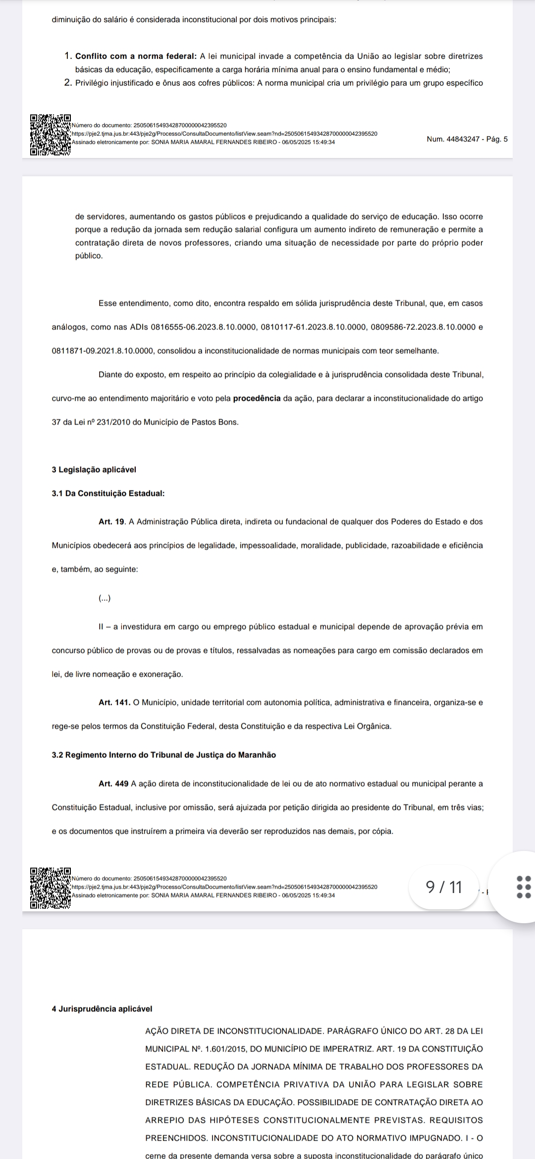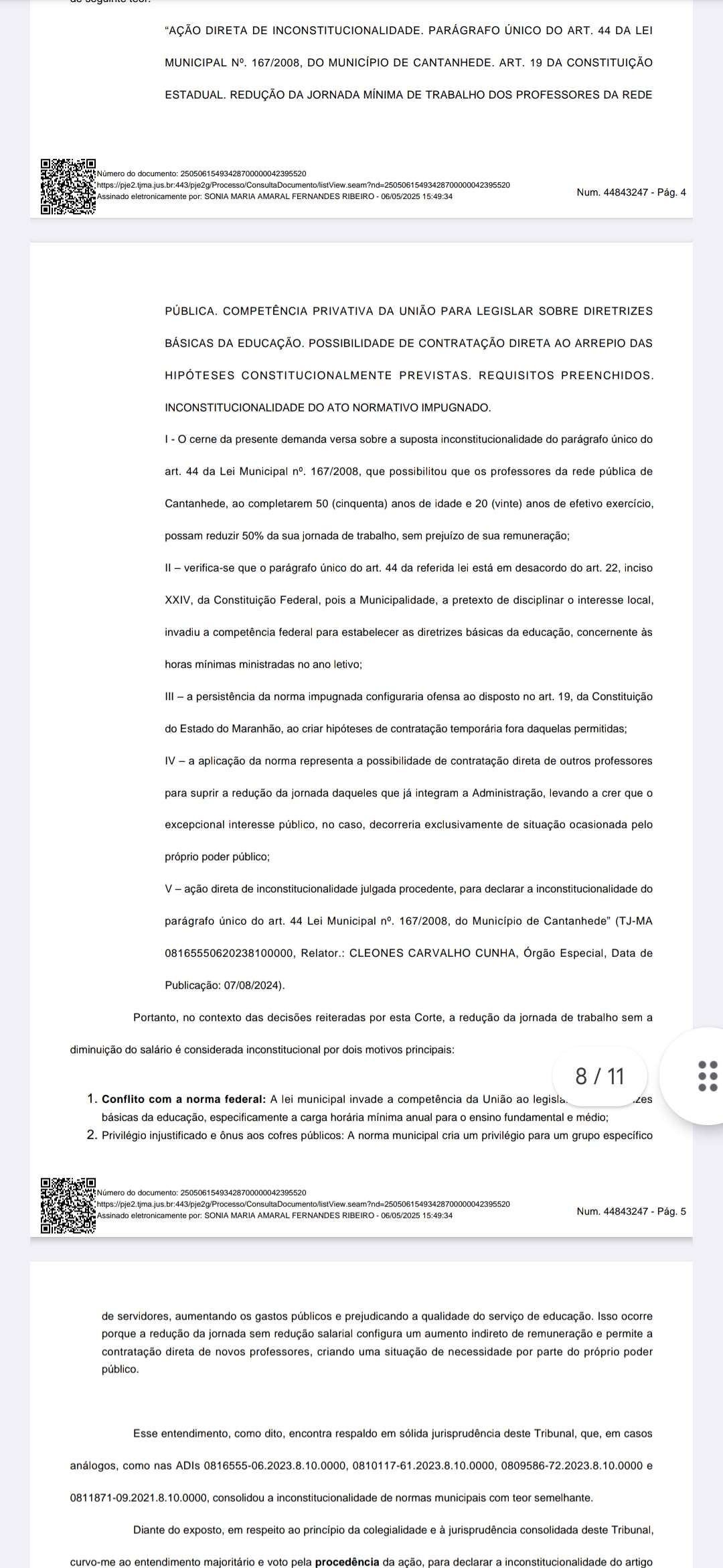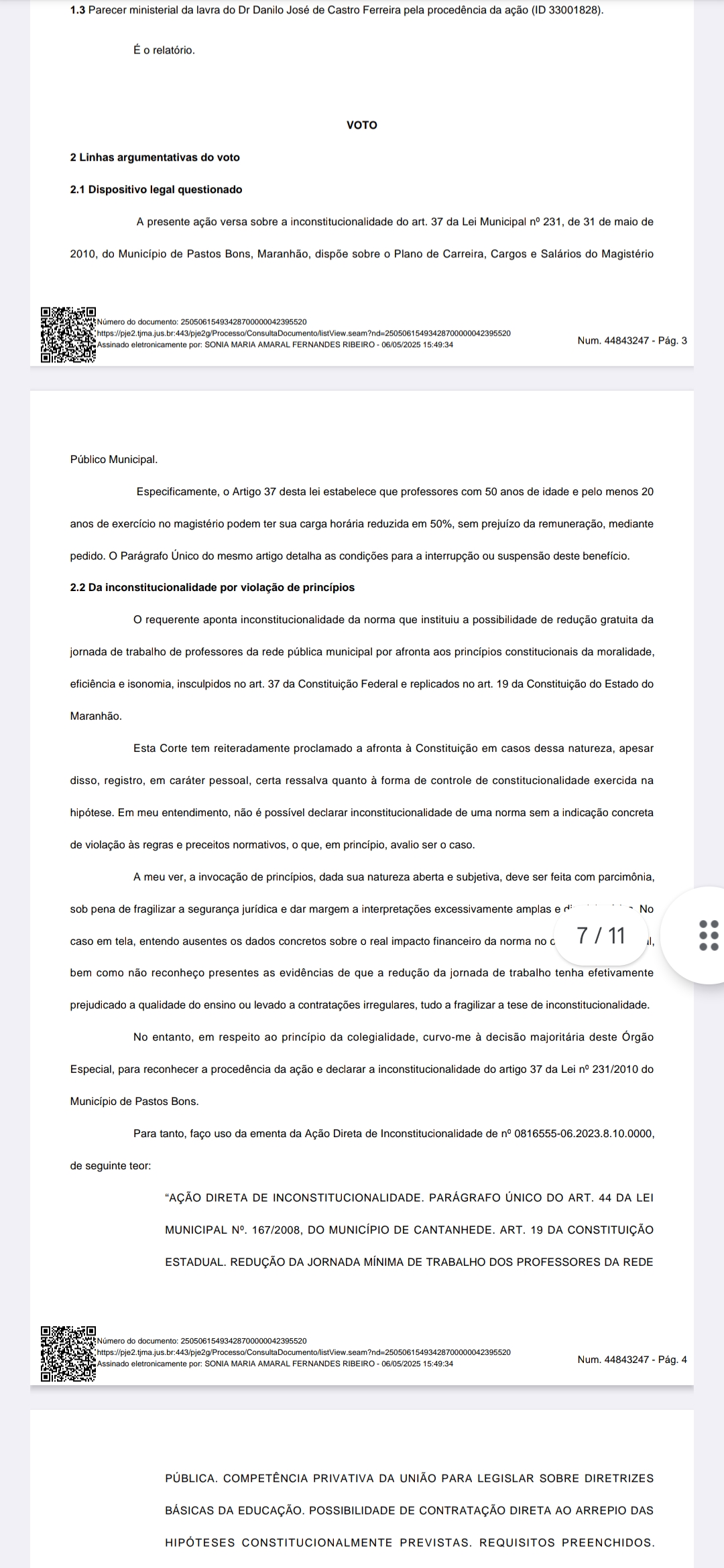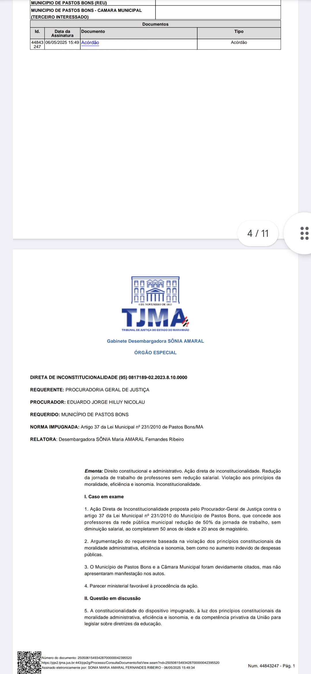 A decisão foi tomada no julgamento da Ação Direta de Inconstitucionalidade nº 0817189-02.2023.8.10.0000, analisada pelo Órgão Especial do Tribunal de Justiça do Maranhão, que declarou inconstitucional o artigo 37 da Lei Municipal nº 231/2010. Esse dispositivo autorizava professores da rede municipal, ao completarem 50 anos de idade e 20 anos de magistério, a reduzir em 50 por cento a jornada de trabalho, sem qualquer redução nos salários.