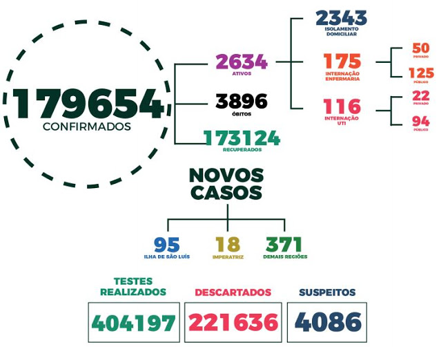 Com mais 484 casos confirmados, o total de infectados chegou a 179.654. Foram registrados mais 95 novos casos na região metropolitana de São Luís, 18 em Imperatriz e 371 nas demais regiões.