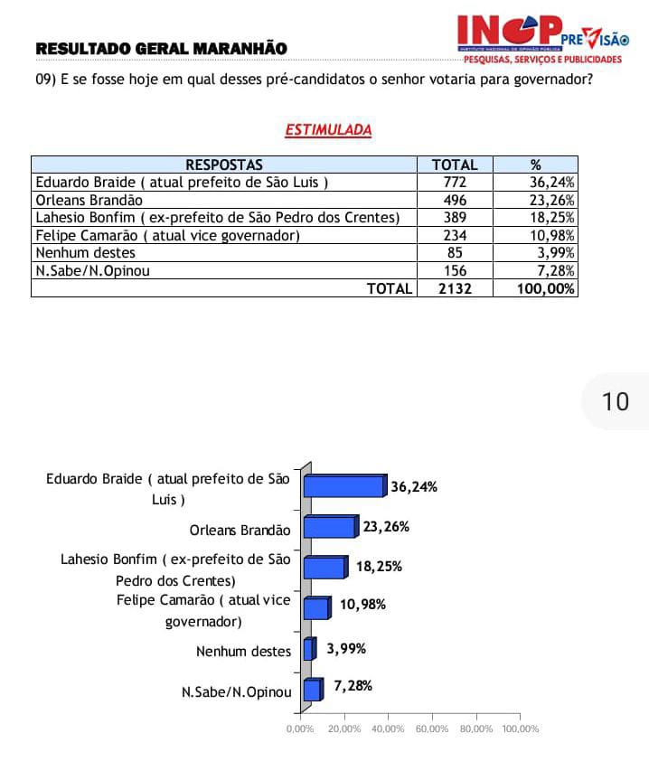 No levantamento, em cenário estimulado, o prefeito de São Luís, Eduardo Braide (PSD), aparece com 36,24%, seguido por Orleans com 23,26%. Os dados também mostram Lahesio Bonfim (Novo), ex-prefeito de São Pedro dos Crentes, com 18,25%, e o vice-governador Felipe Camarão (PT), com 10,98%. Além disso, 3,99% afirmaram que não votariam em nenhum dos pré-candidatos; e 7,28% não souberam ou não opinaram.