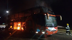 Um ônibus de turismo com aproximadamente 22 passageiros pegou fogo na madrugada desta quarta-feira (30/5), na BR-153, km 72, na cidade de Porangatu (GO).