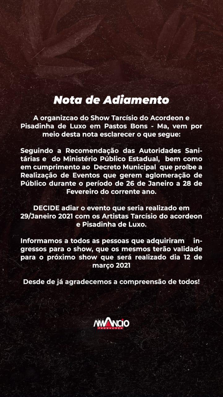 Organização do Show de Tarcísio do Acordeon e Pisadinha de Luxo anuncia adiamento do evento que iria ocorrer dia (29/01) em Pastos Bons