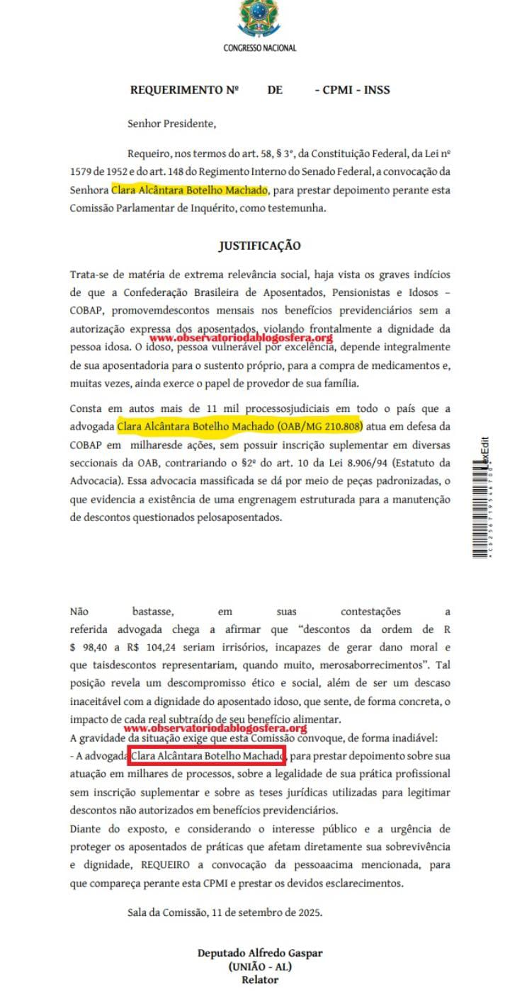 O Relator da Comissão Parlamentar Mista de Inquérito (CPMI), do Congresso Nacional, que investiga uma Roubalheira protagonizada por uma quadrilha organizada para fazer descontos em contracheques de aposentados e pensionistas do INSS, o deputado Alfredo Gaspar (UNIÃO – AL) apresentou Requerimento convocando a advogada Clara Alcântara Botelho Machado (OAB/MG 210.808), que foi apontada na Comissão como representante da Confederação Brasileira de Aposentados, Pensionistas e Idosos (COBAP), uma das cooperativas denunciadas por desviar dinheiro na roubalheira.