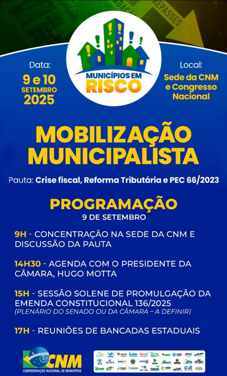 A programação começou às 9h, com concentração na sede da CNM e discussão da pauta. Às 14h30, está prevista uma reunião com o presidente da Câmara dos Deputados, Hugo Motta. Em seguida, às 15h, haverá uma sessão solene para a promulgação da Emenda Constitucional 136/2025, em plenário a ser definido entre Senado e Câmara. O dia encerra às 17h, com reuniões das bancadas estaduais.