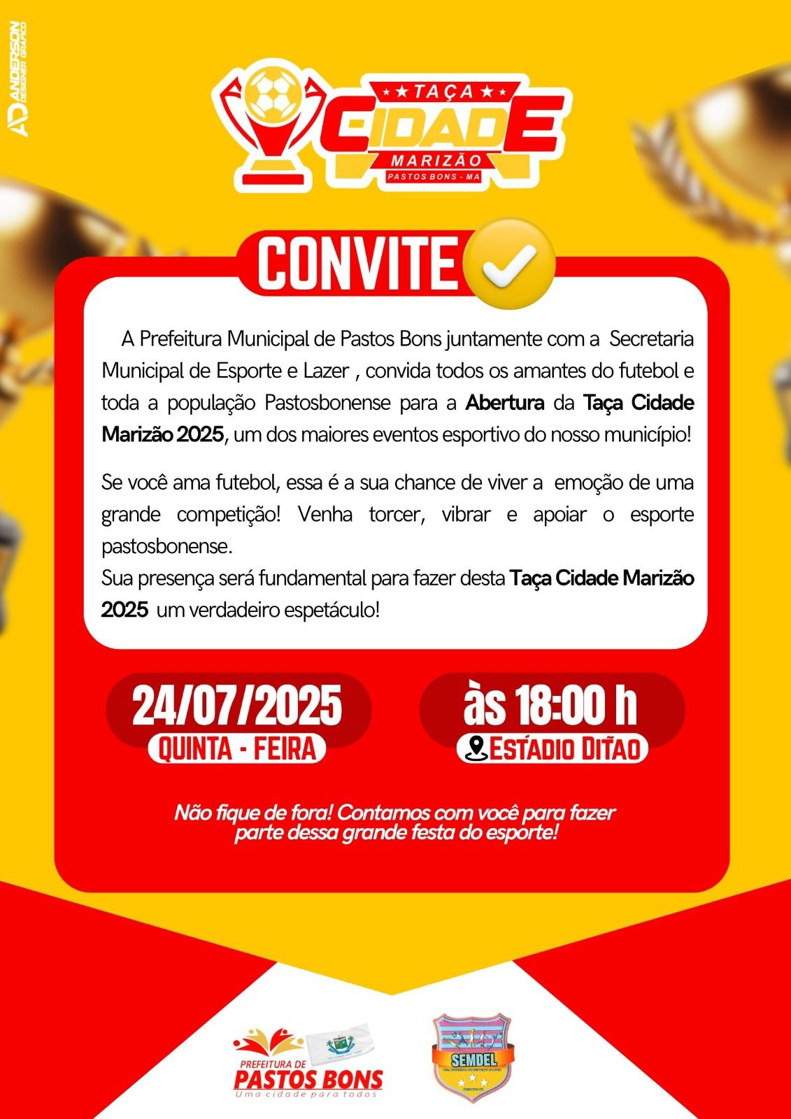 A Prefeitura de Pastos Bons, por meio da Secretaria Municipal de Esporte e Lazer, realizará no dia 24 de julho, às 18h, no Estádio Ditão, a abertura oficial da Taça Cidade Marizão 2025, uma das maiores competições esportivas do município.