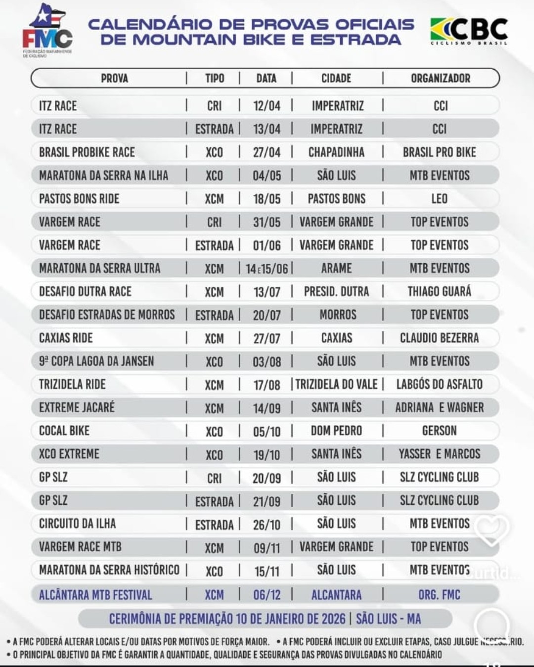 O Calendário Oficial 2025 da FMC conta com diversas provas distribuídas ao longo do ano, abrangendo modalidades como XCO (Cross-Country Olímpico), XCM (Cross-Country Maratona), CRI (Contrarrelógio Individual) e provas de Estrada. A expectativa é de que a competição em Pastos Bons atraia um grande número de ciclistas e entusiastas do esporte.