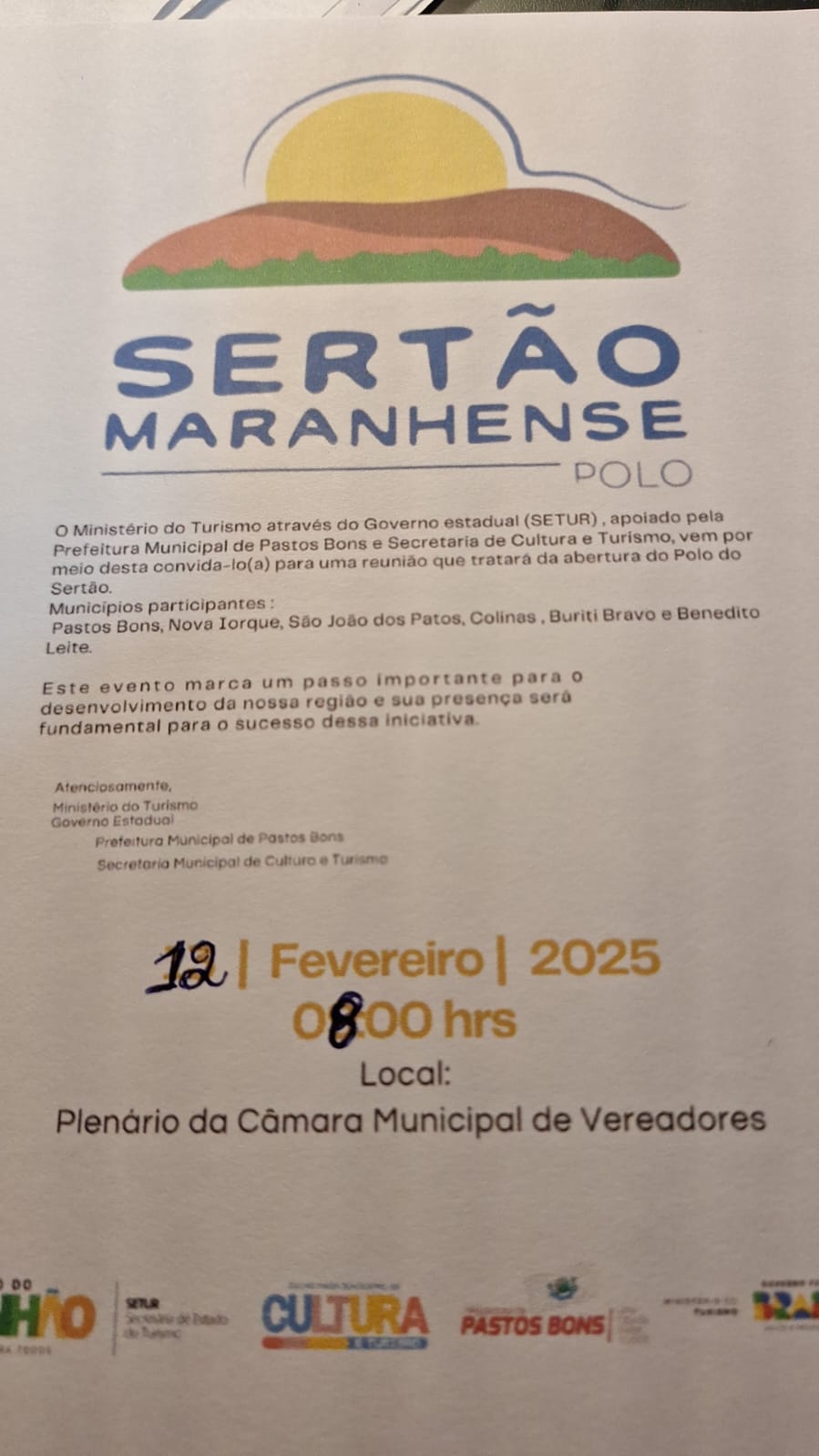 A iniciativa é promovida pelo Ministério do Turismo, por meio do Governo do Estado do Maranhão (SETUR), com apoio da Prefeitura Municipal de Pastos Bons e da Secretaria de Cultura e Turismo. O encontro reunirá representantes de diversos municípios que integram o polo, como Nova Iorque, São João dos Patos, Colinas, Buriti Bravo e Benedito Leite.