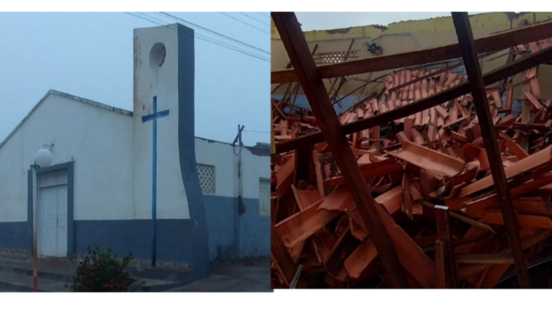 À noite, por volta das 19 horas, um alto estrondo assustou os moradores. O teto não aguentou o peso e caiu no salão de celebrações.