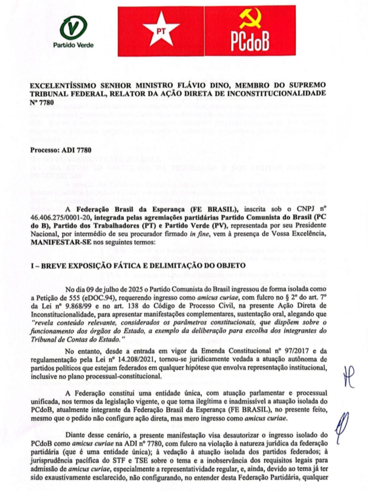 O PCdoB foi desautorizado pela Federação Brasil da Esperança (FE BRASIL), integrada pela legenda comunista, Partido dos Trabalhadores (PT) e Partido Verde (PV), a ingressar para atuar como amicus curiae na ADI n° 7780, que questiona procedimentos na indicação para vaga de conselheiro do Tribunal de Contas do Estado (TCE/MA). A informação consta de manifestação encaminhada nesta terça-feira (15) ao Supremo Tribunal Federal (STF).