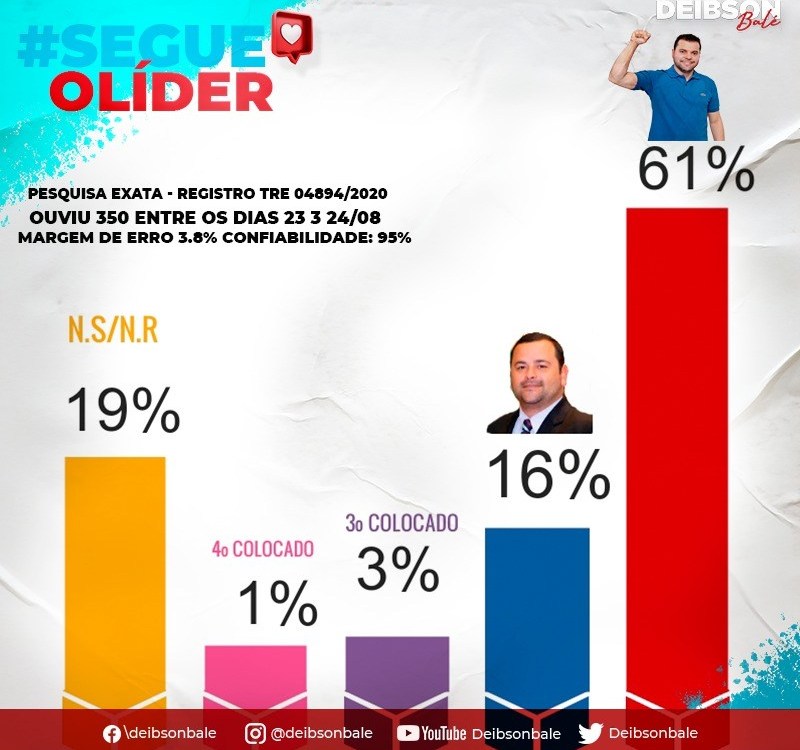 Em outro cenário, com apenas três candidatos Deibson continua disparado na liderança, veja: Deibson Balé 59%; Vinicius Louro 24%, Alcione 6%. Brancos e Nulos somaram 4%. Não souberam ou não opinaram 7%.