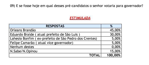 No cenário estimulado, o prefeito de São Luís, Eduardo Braide (PSD) é o segundo colocado, com 30%. Em seguida, o ex-prefeito de São Pedro dos Crentes, Lahesio Bonfim (Novo), e o vice-governador Felipe Camarão (PT) aparecem empatados, com 5% cada. Um total de 15% não soube ou não quis opinar.