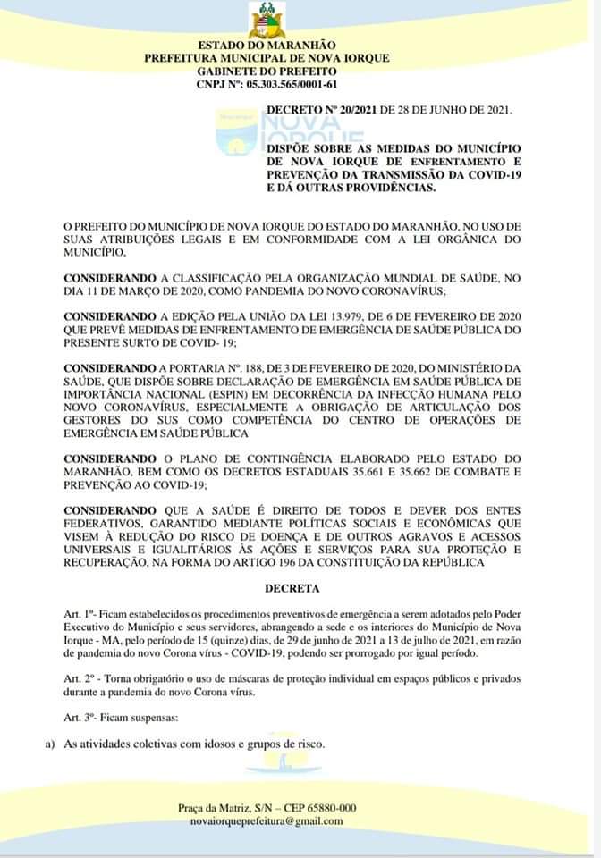 Art. 1º- Ficam estabelecidos os procedimentos preventivos de emergência a serem adotados pelo Poder Executivo do Município e seus servidores, abrangendo a sede e os interiores do Município de Nova Iorque – MA, pelo período de 15 (quinze) dias, de 29 de junho de 2021 a 13 de julho de 2021, em razão de pandemia do novo Corona vírus – COVID-19, podendo ser prorrogado por igual período.