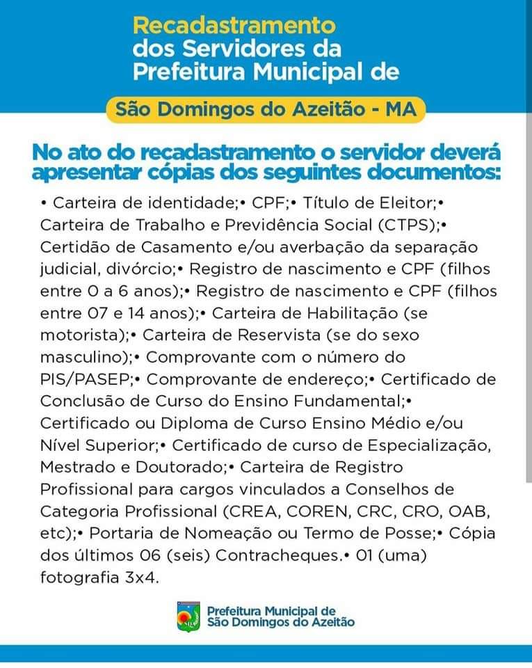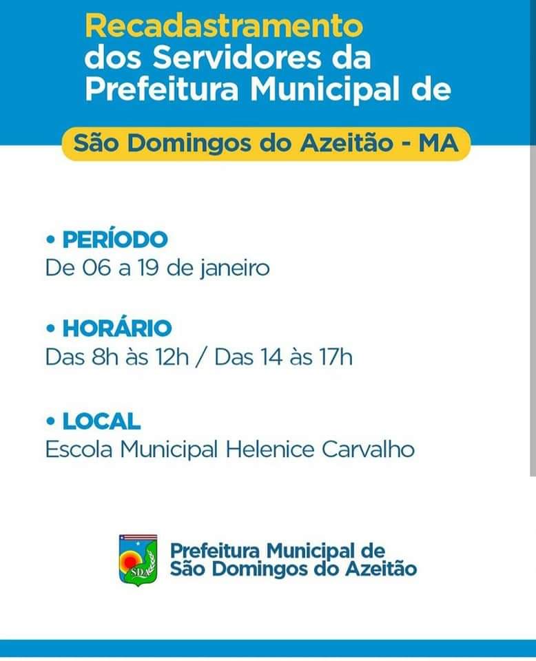A PREFEITURA MUNICIPAL DE SÃO DOMINGOS DO AZEITÃO, por intermédio do seu representante, Prefeito LOURIVAL LEANDRO DOS SANTOS JUNIOR, CONVOCA todos os Servidores Públicos Municipais da Prefeitura de São Domingos do Azeitão-MA, titulares de cargo público de provimento efetivo, para realizarem Recadastramento Funcional, junto a este órgão, que será realizado de 06 de janeiro de 2021 a 19 de janeiro de 2021, no prédio da ESCOLA MUNICIPAL HELENICE COSTA.