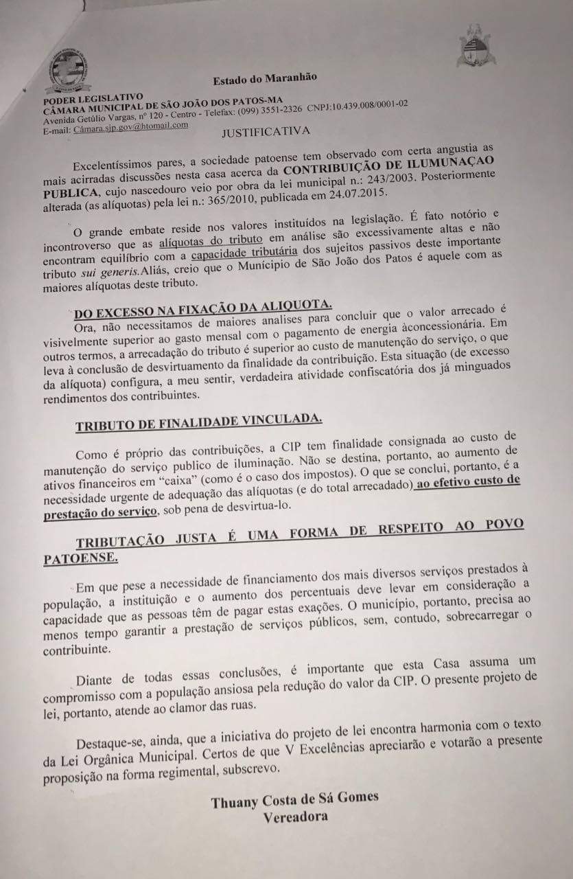 Em Agosto de 2017 a Vereadora Thuany Costa resolveu apresentar um projeto de lei que visa a diminuição dos valores cobrados na taxa de iluminação pública da Cidade de São João dos patos.