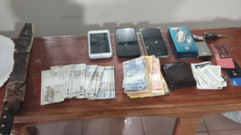 Durante a operação, os agentes abordaram um veículo Fiat Pálio, de cor vermelha, onde estavam três suspeitos, sendo dois homens e uma mulher. Após buscas detalhadas, foram encontrados dentro do automóvel R$ 13.800,00 em notas de R$ 200 falsas, R$ 1.288,00 em dinheiro verdadeiro, além de diversos itens pessoais, incluindo um iPhone 8 de cor rosa, dois celulares Redmi (modelos 13c azul e azul claro), um cigarro eletrônico e um facão.