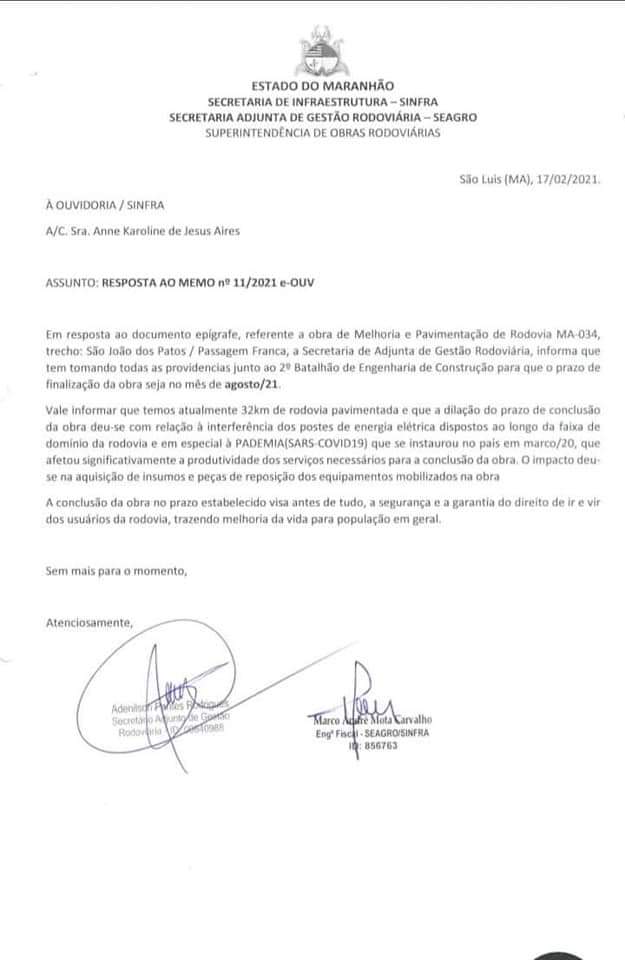A Secretária Estadual de Infraestrutura do Maranhão, informou que no mês de agosto de 2021, o Exército Brasileiro estará finalizando a pavimentação da MA-034.