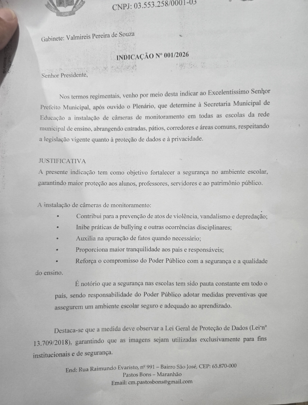 O vereador Valmireis Pereira de Souza apresentou a Indicação nº 001/2026, solicitando ao Poder Executivo Municipal a instalação de câmeras de monitoramento em todas as escolas da rede municipal de ensino de Pastos Bons (MA).